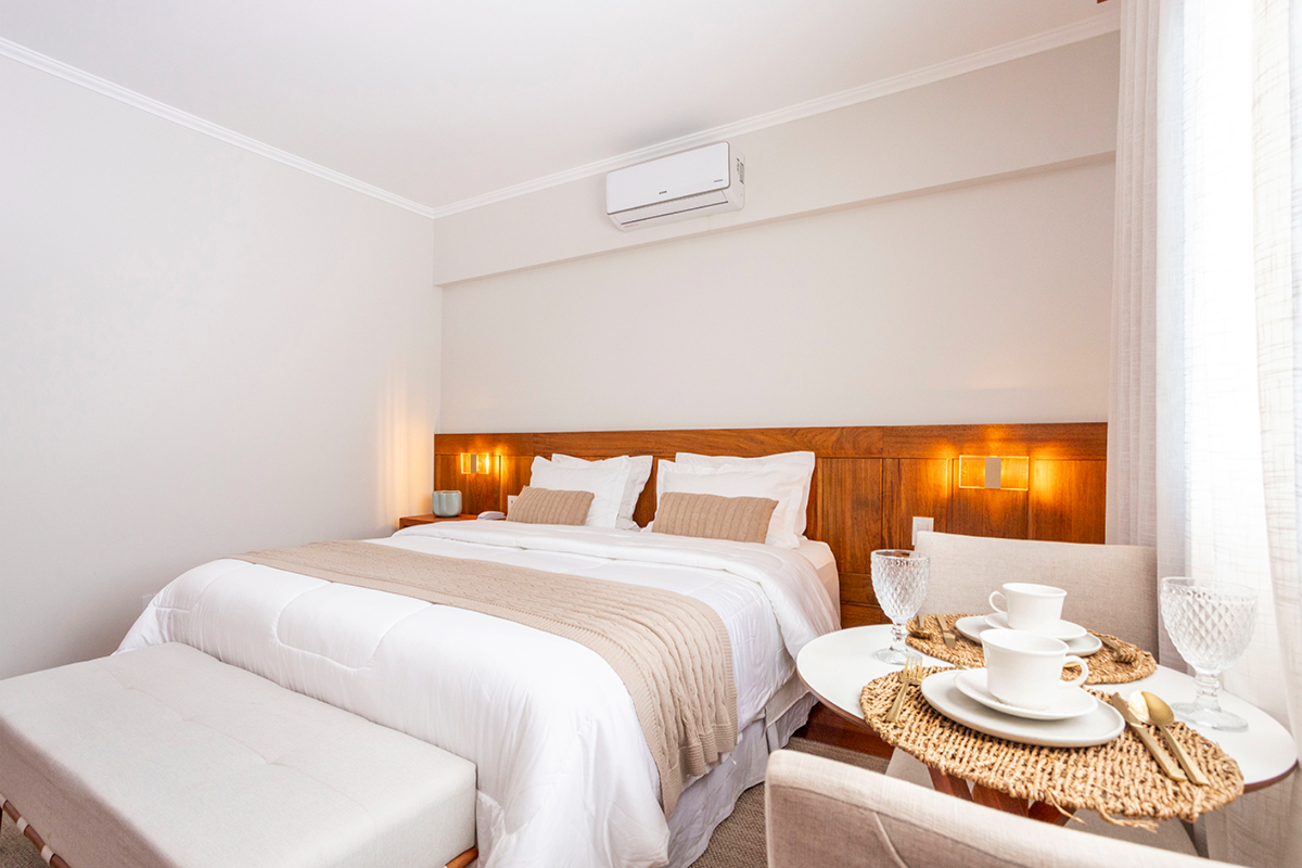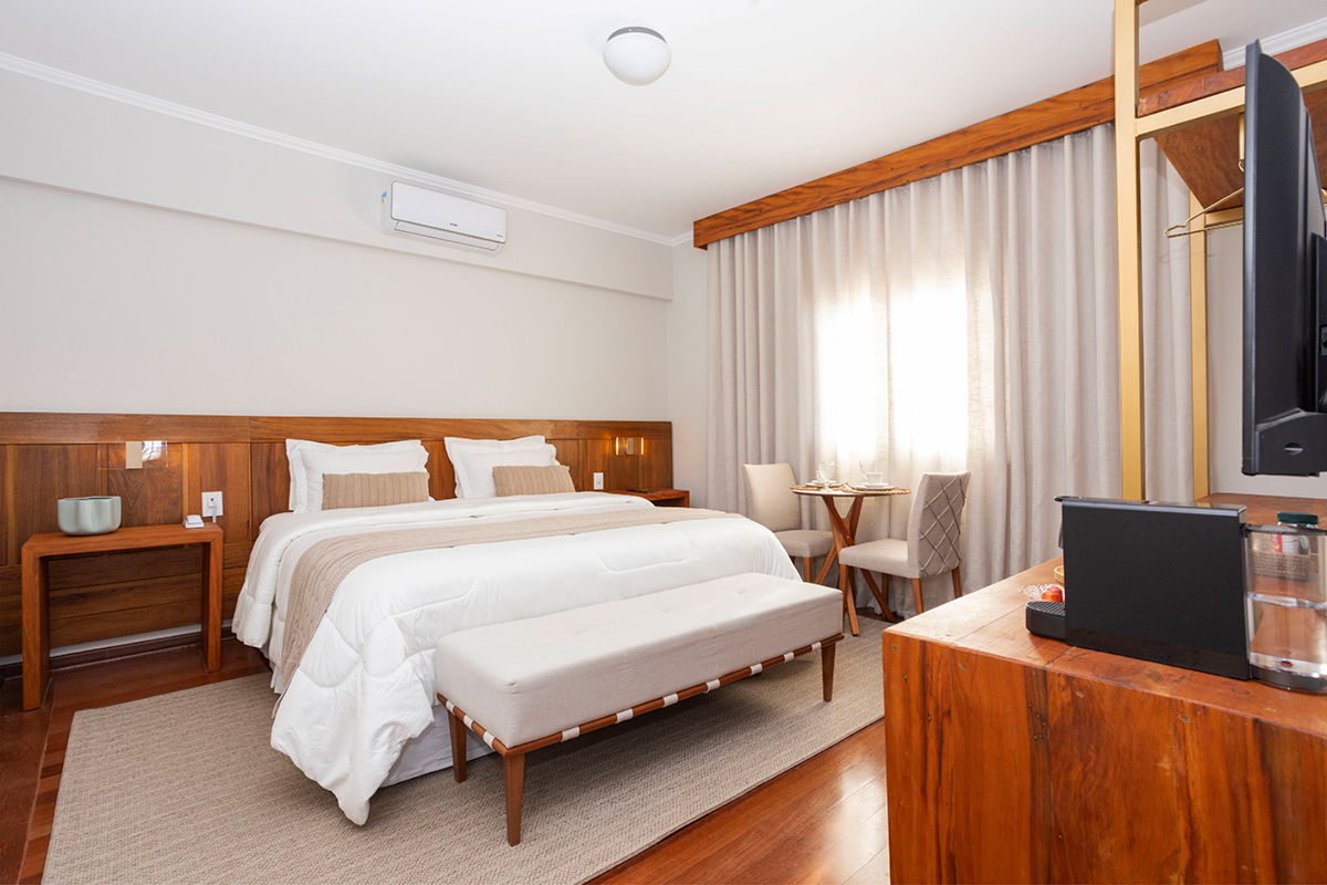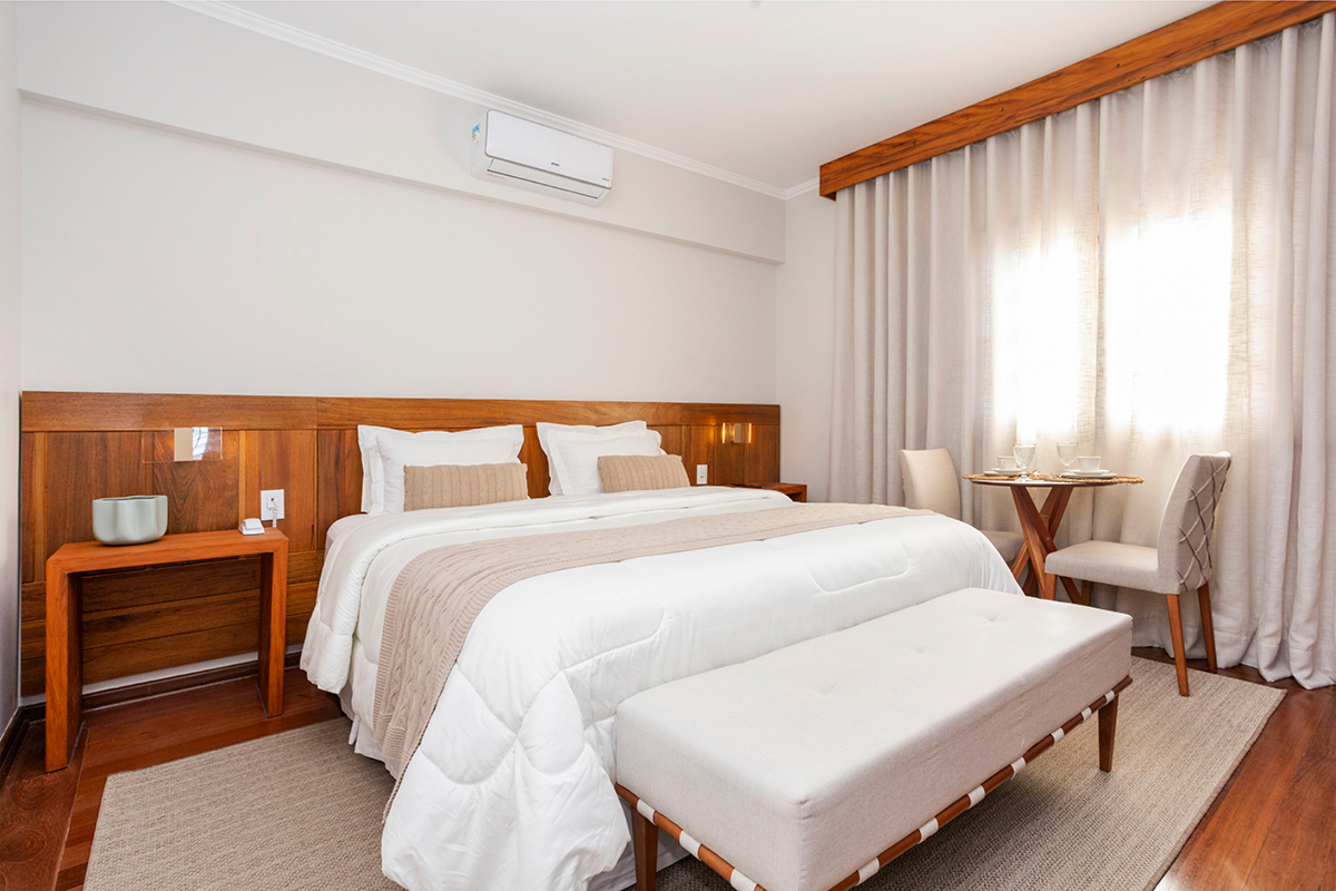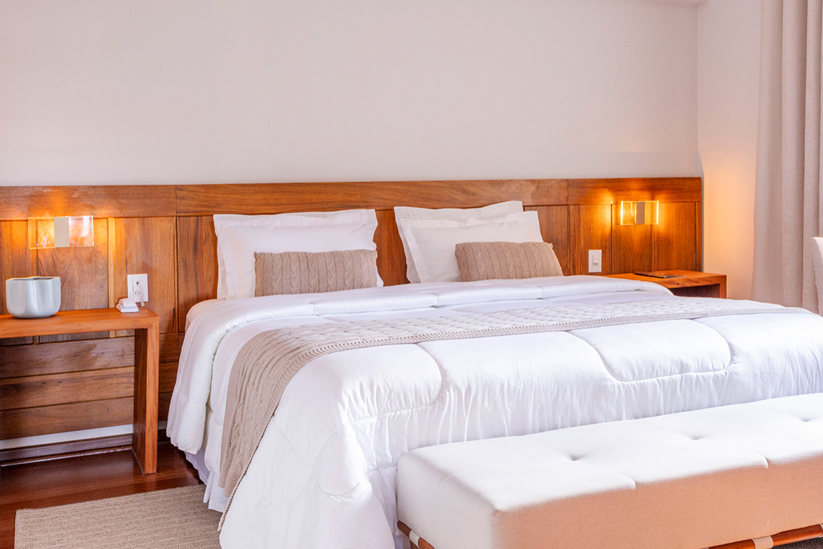 Com vista para o jardim, esta suíte é discreta, acolhedora e serena.