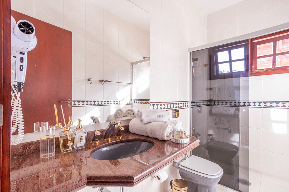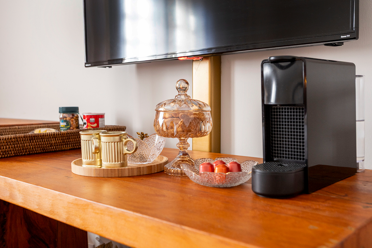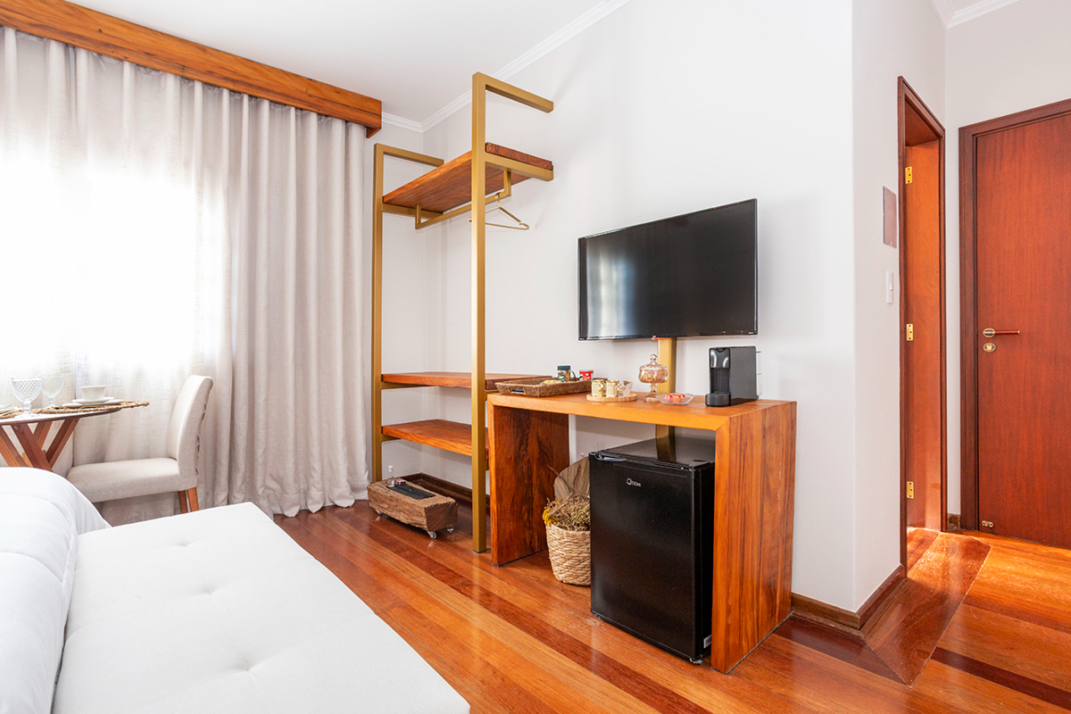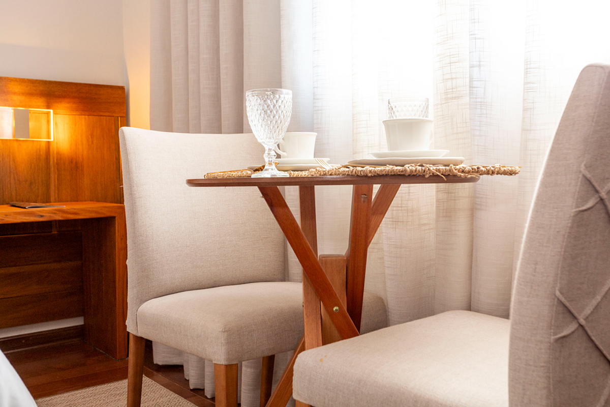 Com vista para o jardim, esta suíte é discreta, acolhedora e serena.